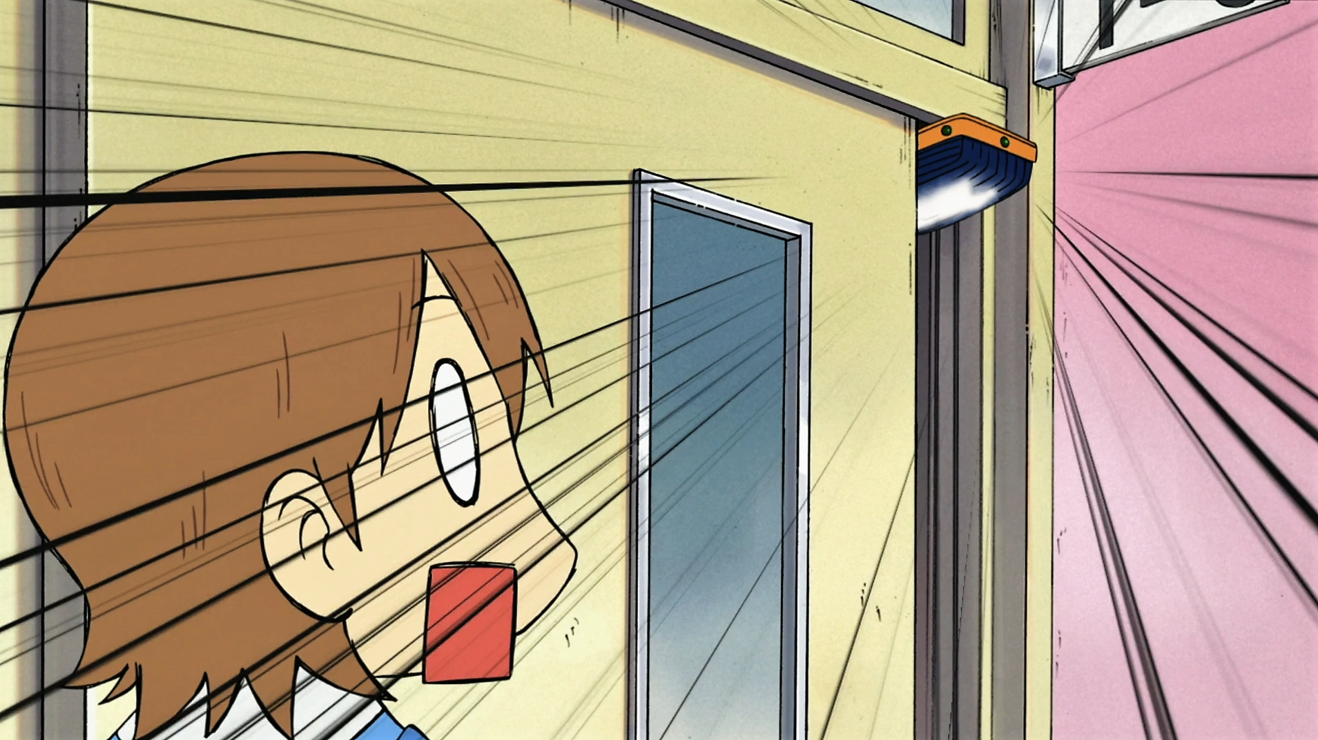 Exhausted from running, Yuuko reaches class 1-Q. She wonders how she was stopped by four red lights. She reaches for the door, bemoaning the fact it will be the first period already. She suddenly notices that the sliding door is slightly ajar. She looks up and sees an eraser wedging the door open. She panics a little over this obvious trap. She figures she'd never fall for such an obvious trap and goes to the other door, only to find it also has an eraser trap! Yuuko starts to get upset and wonders what she did to get punished like this, other than being late. She figures she can just sneak in through the back door, but it's locked! She decides she'll sneak in through the lower door, but is floored to find another eraser trap. Yuuko had a feeling something like this would happen, and Mai is the only one who would do it. Yuuko then decides to try going above the door, but is astonished to find that it is all newly-installed stained glass! Yuuko starts to run off, but soon realizes that won't solve anything. Yuuko resolves that, since she'll get in trouble no matter what she does, she might as well go in guns blazing and die fighting. Wouldn't that be cool? She'll go in through the front entrance. She'll take an eraser to the face while smiling and roll with the punches, imagining the scene. The entire class should burst into laughter, and Takasaki-sensei shouldn't get mad. Yuuko tells herself that her plan will work, if she's bright and cheerful about it. She opens the door, the eraser falls on her head, and she cheerily says good morning to the class, adding "Just kidding!" She then sees a completely empty class; a message on the board tells her that first period will be in another room. Yuuko sighs.