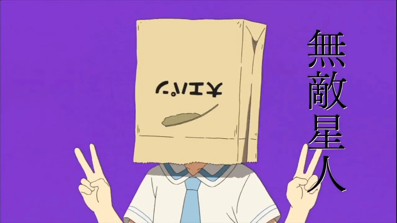 Yuuko is wearing a paper bag on her head, laughing and making cutting motions with her fingers. She declares, "I'm an invincible alien!" as Mio and Mai look on. Mio, a little embarrassed, asks why Yuuko is acting stupid; is she a grade schooler? Yuuko replies confidently that invincible aliens are immune to any and all attacks! The distinctive ping of a metal bat is heard nearby, and Yuuko is struck in the head by a baseball. She falls to the ground and twitches. The student who hit the ball calls out an apology and asks if she's alright, but Yuuko is in far too much pain to answer.