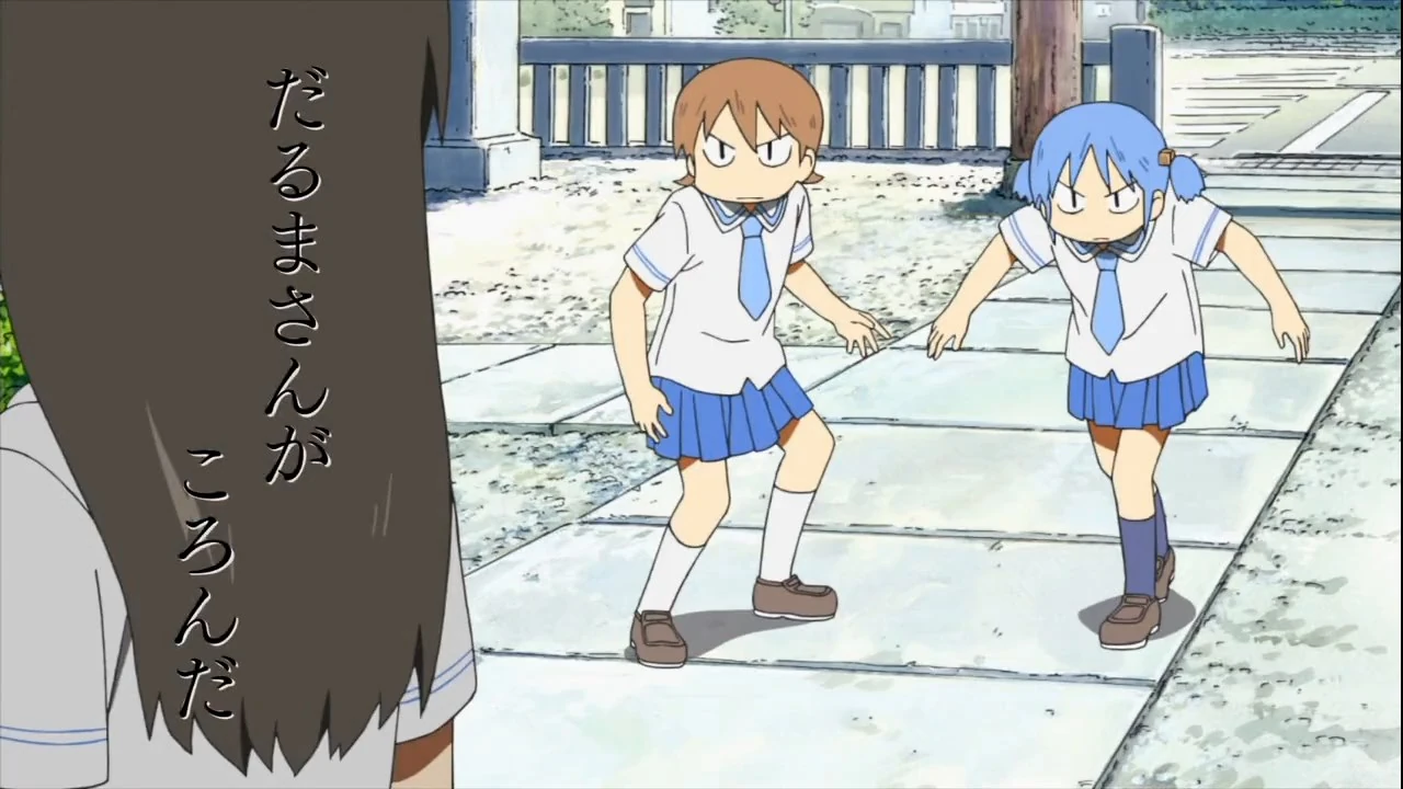 In front of a shrine, Mai Minakami is "it" in a game of 'Darumasan ga koronda', also known as Red Light, Green Light, with Yuuko Aioi and Mio Naganohara. She turns and says "red light", making Yuuko and Mio freeze in their tracks. She holds it for a lot longer than it is usual in the game. To the shock of her friends, Mai then just sits down, takes off her shoes and continues staring at them. Mio and Yuuko struggle with keeping perfectly still for so long. Birds end up landing on their heads, but Mai continues to say nothing.