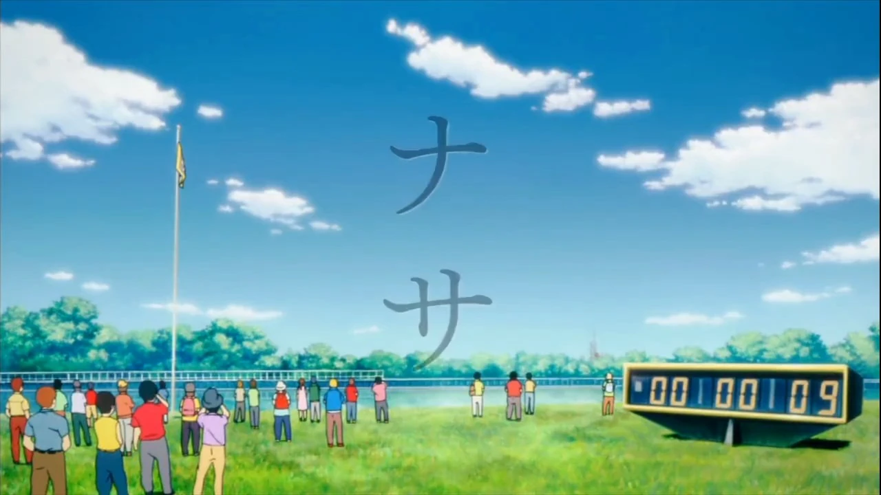 Haruna Annaka reads a sign announcing nagashi soumen[2] in the park today and thinks to herself that she's decided to check it out. She's only seen nagashi soumen on television before, so she's really excited. She hasn't eaten yet, so she's going to stand near the front and eat her fill! She enters the park and is disappointed to find that nagashi soumen is nothing more than a bamboo shoot extending from someone's window to the ground; further, she's the only one there. A woman suddenly opens the window and tells Annaka to get ready, and throws a glass of water with noodles down the bamboo. Annaka is shocked and the noodles hit the dirt. The woman yells at her, telling her she's never seen such a lousy customer. Annaka is stunned. The woman announces that round two is coming up; Annaka nervously asks the woman if she has any chopsticks; the woman angrily tosses her a set, but Annaka finds that they have been used; the woman claims they're recycling. Time waits for no one, so the woman sends the second round of noodles. Annaka decides she'll have to use the back ends of the chopsticks. The woman then sends a baseball; Annaka grabs it in disbelief. The woman tells her it's transient humor. Annaka doesn't know how to respond.