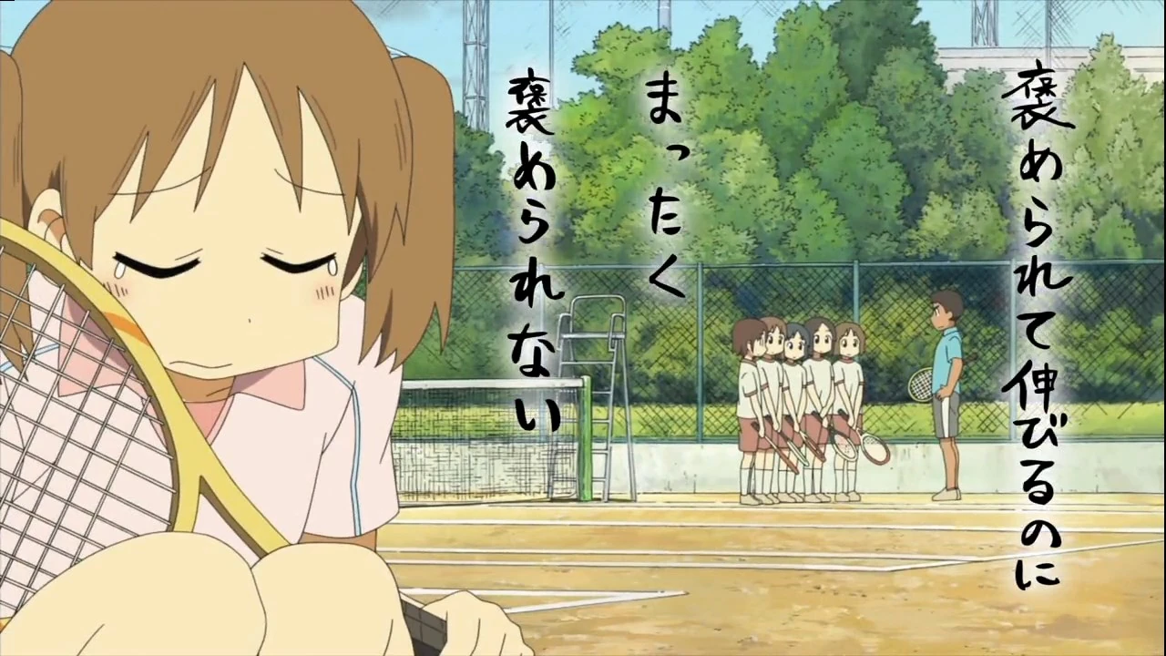 A tennis instructor tells his first-year students that some people respond to praise, and others respond to criticism. He'll be using his intuition to tell them apart. Another girl is sitting off court and listening in, and then closes her eyes and begins to cry. The female narrator tells us her thoughts: "I respond to praise, but I never receive any."