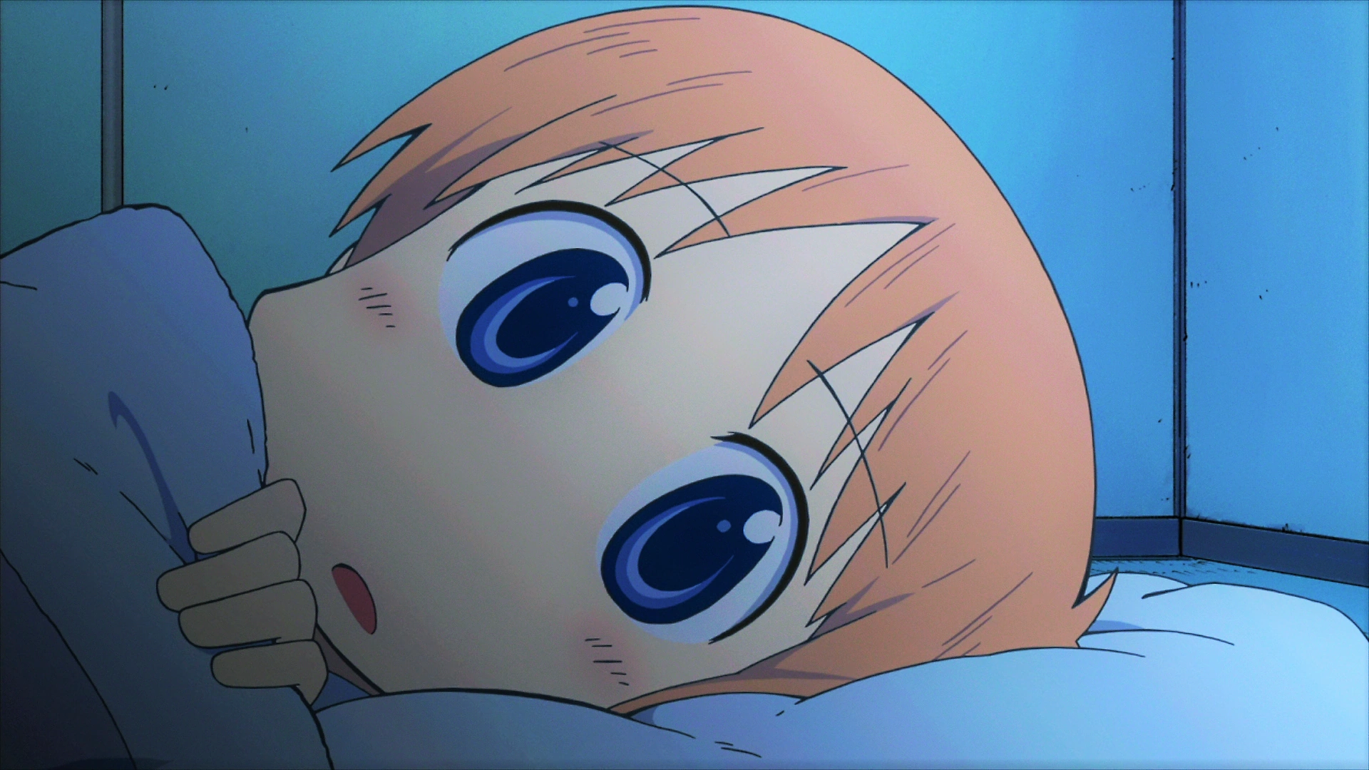 Sakamoto lets out a frustrated sigh and thinks to himself that kids are hopeless. He decides that he'll take Hakase to the restroom, which should remind her just how grateful she should be to have Sakamoto around. Sakamoto addresses Hakase and tells her that he'll go with her, but quietly responds that Sakamoto is small and weak, so he doesn't have to. Sakamoto is mortified by this statement, losing all color and becoming stiff as a board. After a moment of tense silence, Hakase turns and looks at Nano's sleeping face; whatever Nano is dreaming about, it's making her very happy. Hakase remembers back to that morning, when Nano was watching the schoolgirls and Sakamoto told her that Nano wants to go to school. Hakase is worried and begins queitly crying to herself. At this point, Nano begins to stir. Hakase tells Nano they should go to the bathroom together. When Nano says that she doesn't have to go, Hakase admits that she's scared and needs Nano to go with her. The two get out of bed. Sakamoto, still sitting on top of them, continues to be petrified as their movements jostle him around.