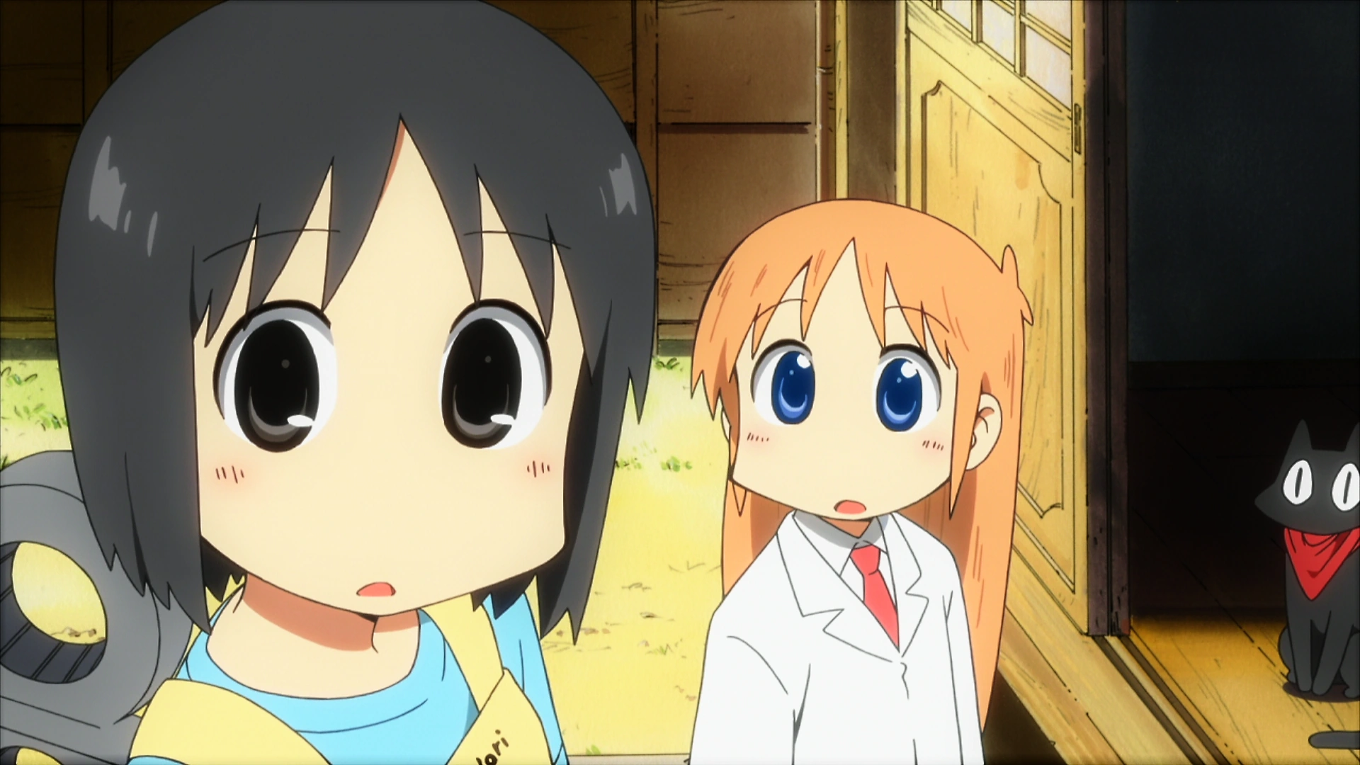 It's another beautiful day at the Shinonome household as Nano hangs laundry outside. Sakamoto wanders out onto the porch with an annoyed look on his face, complaining to himself that he's hungry. He then notices something to his right: a fish, placed in an obvious trap consisting of a big wicker basket, held up by a stick with a rope attached to it. Sakamoto figures Hakase is up to one of her silly tricks again; but he is hungry, and what's the harm? He goes into the trap and starts eating the fish. Offscreen, Hakase then pulls on the rope, releasing the trap. The stick holding it up whacks Sakamoto in the chest and drags him along by his front legs. Sakamoto shrieks in pain. Hakase emerges from behind the corner, gleefully teasing Sakamoto for having fallen for her trap. Sakamoto trembles as he gets up, dismayed. Suddenly Nano appears as she picks up the fish Sakamoto was eating; she says that it was going to be for lunch. Hakase teases Sakamoto, who fires back that she's guilty, too. Hakase and Sakamoto begin to argue, each blaming the other. Nano suddenly overhears another conversation and turns her head to the open gate leading to the alleyway; it's a bevy of schoolgirls, happily chatting with each other on their way to school. Nano watches them wistfully as they go by. Sakamoto takes a second to stop arguing with Hakase to notice Nano as she pines away. Hakase turns to see what Sakamoto is looking at and looks at Nano herself. Sakamoto turns and jumps back onto the porch in order to get closer to Hakase so he can talk to her.
