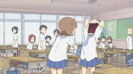 a student helps Nakanojou up off the floor, and Mai takes a break from reading her manga to see what will happen. Mio and Yuuko finally let their fists fly; but instead of punching each other, their hands meet in a hardy clasping of hands. The two smile at each other, argument resolved and friendship restored with a handshake. Mai gives a small smile, seemingly relieved to see her friends make up. Nano watches in awe and cries out, "Amazing!", as Mio and Yuuko hug. The rest of the class goes back to their regularly scheduled programming.