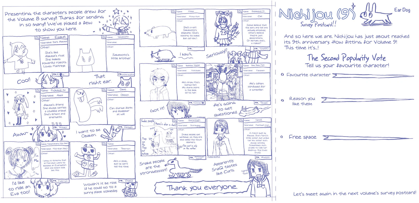 Finally, the results from Volume 7's survey are presented by Mio and Fecchan [which probably means there's at least a survey from Volume 7 I'm missing; though it might not have anything interesting]. There was just a free space to fill, which readers used to write stuff or draw stuff, each of which Mio and Fecchan react to -- all negatively. Another survey is given, requesting readers draw minor characters they'd like to see introduced in future chapters of Nichijou.