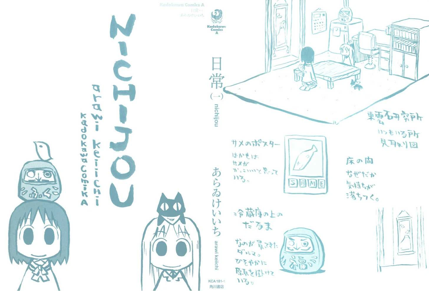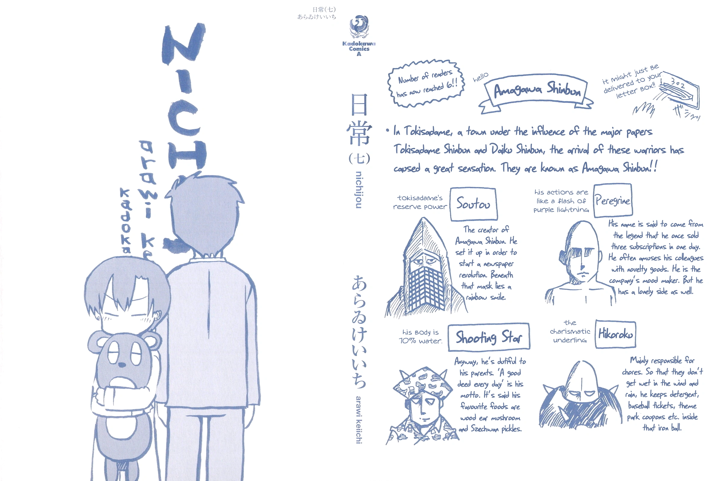 Volume two features a sketch of a typically nervous Izumi Sakurai, who has taken a brush to fix an error in Kadokawa Comics (Nichijou is published by Kadokawa Shoten). On the opposite is a series of sketches with short descriptions, labeled random facts. Starting with the sketch of the high school and going clockwise: