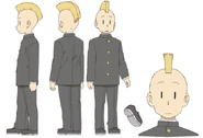 Nakanojou has yellow hair with a natural mohawk. He said that his hair does not grow on the sides (his hair only grows on the center). At some point, he tried to alter the style of his hair to make it look normal, but it does not take long until it changes back to its natural mohawk look. After being shaved by Nakamura-sensei, he was bald until Principal Shinonome accidentally put hair grower on his bald head.